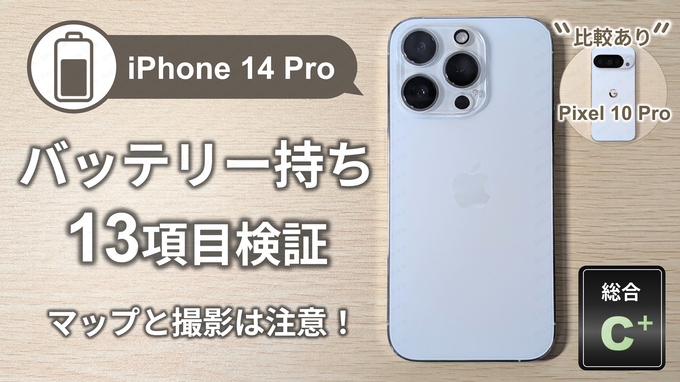 iPhone 14 Proのバッテリー持ち総合評価まとめ表。総合評価はCプラス(普通)。Pixel 10 ProはB(よい)でややPixel 10のほうが上な結果